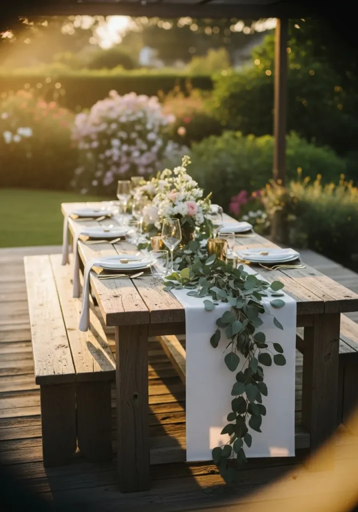 This long outdoor dining table is dressed in crisp linens, natural greenery, and simple place settings that feel refined but never fussy. The wooden table and garden surroundings bring in warmth, while the centered runner keeps everything looking polished and intentional. It feels like the kind of setup that invites people to linger and enjoy the moment.