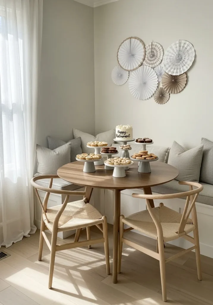 This bright dining nook is styled with soft wood furniture, neutral cushions, and a sweet table arrangement that feels perfect for a daytime retirement brunch. The wall decor adds interest without stealing attention, and the table setup feels airy and approachable. Everything works together in a calm and cohesive way.