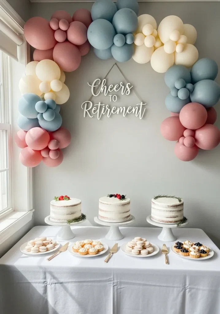 This backdrop features flowing neutral fabric paired with subtle gold balloons and a simple retirement sign. The draping adds texture and movement, while the color palette keeps it elegant and timeless. It feels like a lovely focal point for the room.