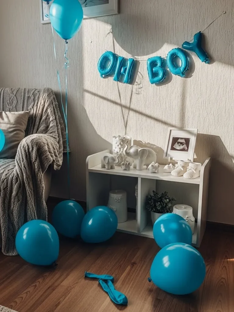 This sweet little setup leans into classic baby boy charm with soft blue balloons scattered casually around the room and metallic letter balloons spelling out a cheerful oh boy on the wall. The neutral backdrop keeps everything calm and cozy while the pops of blue feel playful without being loud. I love how the small white shelving unit anchors the space with simple baby decor like ceramic animals tiny booties and a framed ultrasound photo. It feels thoughtfully styled but still relaxed like a real home that just happens to be celebrating something special.