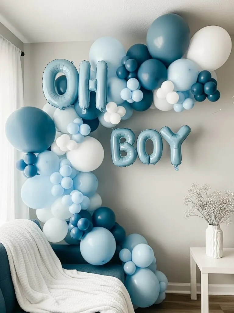 This living room setup feels calm and cozy while still making a statement with its soft blue balloon arch cascading across the wall. The mix of powder blue, dusty teal, and crisp white balloons creates a layered look that feels intentional without being too polished. Oversized letter balloons spelling out OH BOY add a playful focal point while blending seamlessly into the color palette. The neutral wall color, simple white side table, and cozy sofa with a textured throw keep the space grounded so the balloons really get their moment to shine without overwhelming the room.