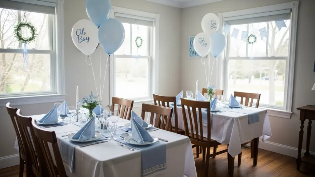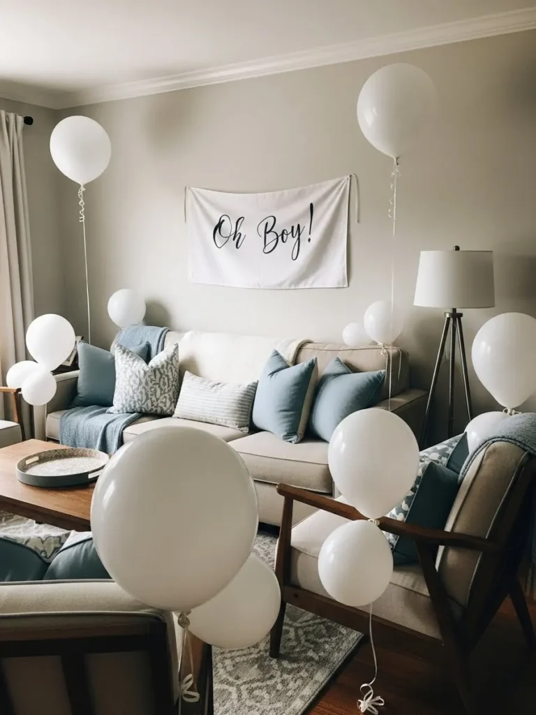 This living room setup feels calm and intentional with its neutral sofa, soft blue accent pillows, and crisp white balloons floating effortlessly around the space. The muted wall color and simple crown molding keep everything classic, while the Oh Boy banner adds just the right amount of celebration without overpowering the room. I love how the blue tones are layered through throws and cushions instead of bold decorations, which makes the space feel styled rather than themed. The mix of cozy seating, warm wood furniture, and gentle lighting creates a welcoming atmosphere that still feels polished and timeless.
