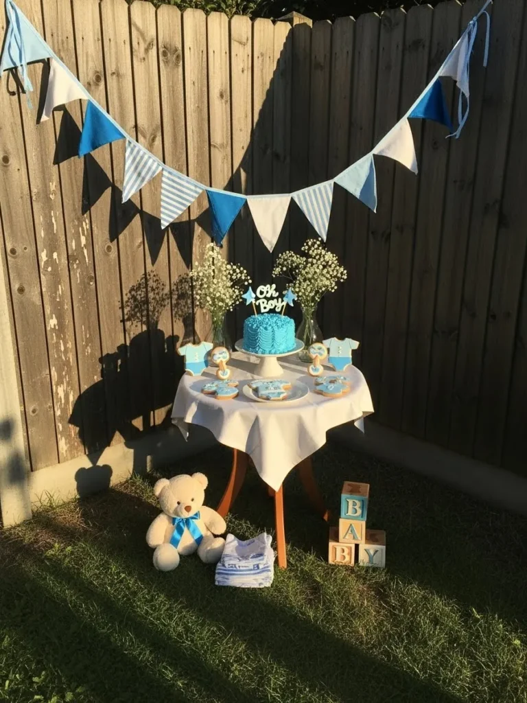 This sweet backyard setup feels like a timeless baby shower moment frozen in the golden afternoon sun. A simple round table is dressed in a crisp white cloth and topped with a soft blue cake that instantly steals the show. Coordinating treats sit neatly on small plates, all in calming shades of blue and white that feel traditional without being boring. The wooden fence backdrop keeps things grounded and cozy while the blue and white bunting adds just the right touch of celebration. Little details like the teddy bear, baby blocks, and folded blankets make the space feel warm and personal rather than over styled.