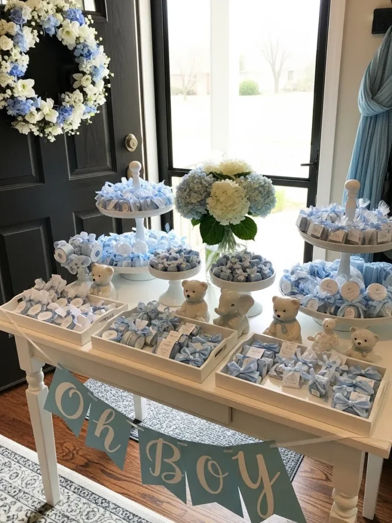 This setup is all about classic charm with a soft baby blue palette that feels sweet without being over the top. The white console table keeps everything looking clean and airy, while tiered trays filled with blue wrapped treats add height and balance. Little teddy bear accents bring in that adorable baby vibe without feeling kitschy, and the hydrangea arrangement in the center ties the whole look together beautifully. I also love how the simple Oh Boy banner anchors the table and makes it feel intentional but still relaxed.