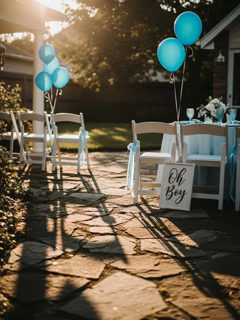 This setup features crisp white folding chairs lined along a stone pathway with soft blue balloon clusters tied neatly to each seat. Light blue ribbons add a sweet touch without feeling overdone, while simple table settings nearby keep the look airy and uncluttered. The outdoor setting does most of the work here, with warm sunlight, greenery, and clean lines creating a timeless baby shower atmosphere that feels calm and welcoming instead of themed to the max.