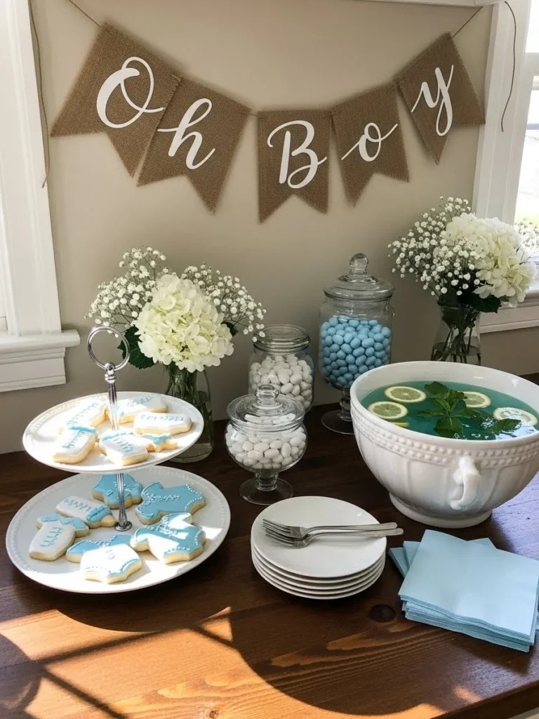 This setup leans into a soft rustic look that feels warm and welcoming without trying too hard. The burlap Oh Boy banner sets the tone right away, adding texture and that cozy farmhouse vibe everyone loves. White florals mixed with baby blue accents keep the palette classic and clean, while glass jars filled with treats add a simple vintage touch. The wooden table grounds everything and makes the whole display feel relaxed, like it belongs in a sunlit dining nook rather than a rented venue.
