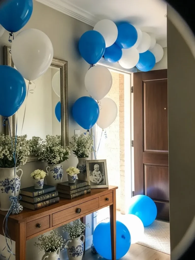 This baby shower setup leans into timeless charm with crisp blue and white balloons framing the entryway in the sweetest way. The balloons are clustered overhead and along the walls, creating a soft arch that instantly feels celebratory without being over the top. Warm wood furniture anchors the space, while delicate white florals in patterned vases add a vintage touch that feels thoughtful and homey. The framed baby photo and stacked books bring in a sense of nostalgia, making the whole entryway feel personal and meaningful rather than styled just for a party.