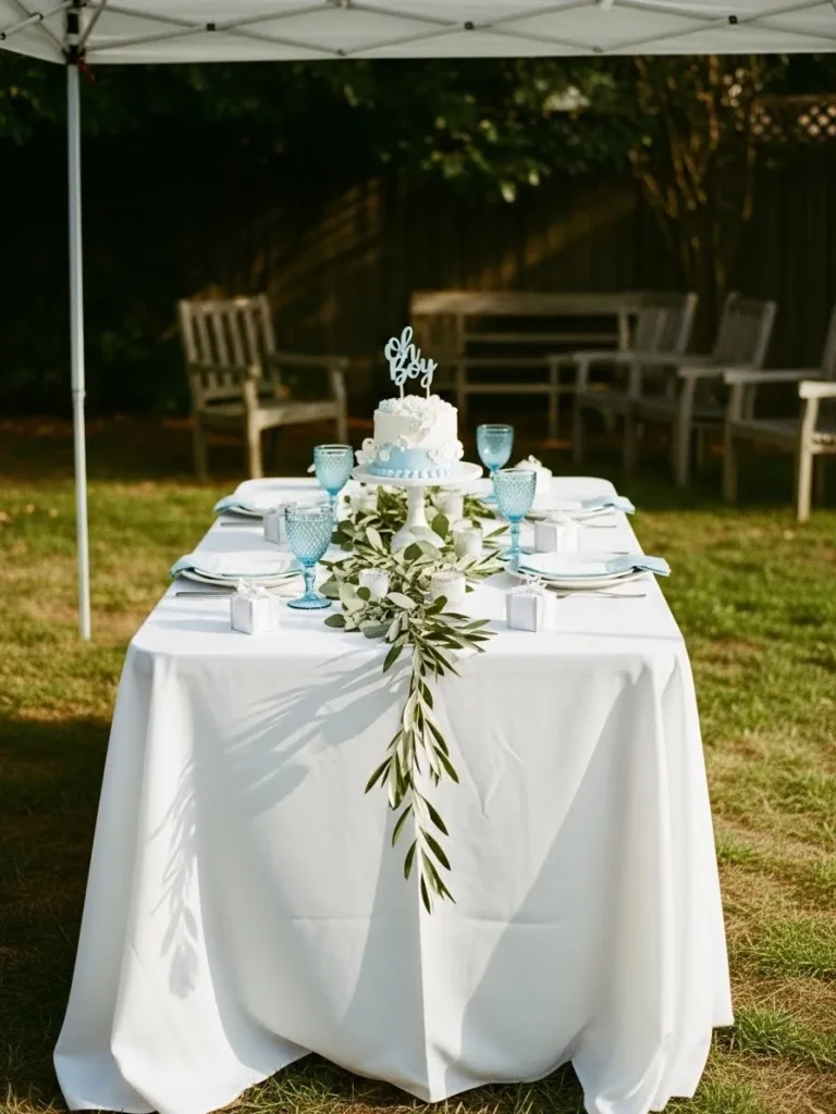 This setup feels like a timeless outdoor baby shower moment with a clean white tablecloth layered under soft blue glassware and simple greenery running right down the center. The crisp place settings keep everything polished while the light blue accents add just enough color to signal a baby boy celebration without feeling themed or overdone. The small cake placed front and center brings a sweet focal point and the natural backyard setting gives the whole scene an airy relaxed charm that feels effortless and welcoming.