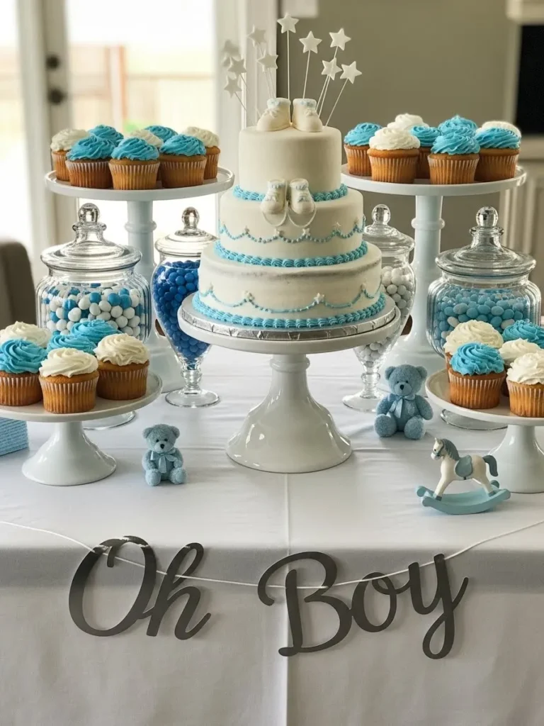 This setup is all about timeless charm with a soft blue and white color palette that instantly feels sweet and celebratory. The tiered cake takes center stage with delicate piping and tiny baby shoe details that feel nostalgic in the best way. Matching cupcakes sit on classic white cake stands, creating balance and symmetry that looks polished without trying too hard. Clear glass jars filled with blue and white treats add texture and shine, while small teddy bears and a rocking horse bring in that gentle baby shower magic. Everything feels intentional, clean, and beautifully coordinated from top to bottom.