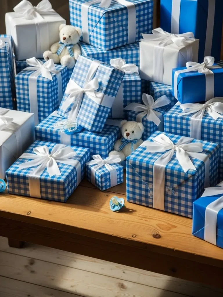 This setup leans into timeless charm with stacks of blue gingham wrapped gifts paired with crisp white ribbon bows. The repeating pattern feels cozy and traditional while still looking polished and intentional. Soft teddy bears tucked between the boxes add a sweet nursery touch without feeling overly themed. The mix of box sizes creates height and interest, and the clean blue and white color palette keeps everything calm and cohesive. It feels thoughtful and nostalgic in the best possible way.