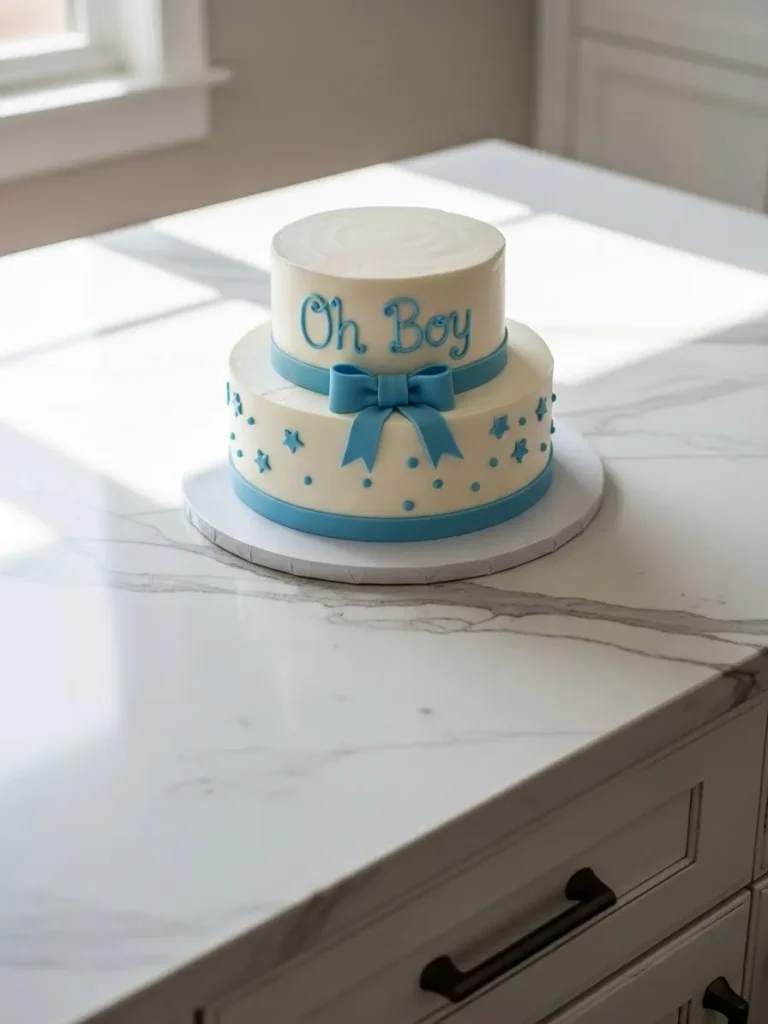 This setup feels like a timeless baby shower dream with its soft blue and white color palette and beautifully styled cake as the centerpiece. The tiered cake has clean lines delicate detailing and a simple Oh Boy topper that instantly sets the tone without feeling overdone. Everything is arranged on a warm wooden table with crisp white linens which keeps the look polished but still relaxed. The matching blue treats bowls tiny baby shoes and fresh floral accents add just enough charm while keeping the overall design balanced and uncluttered.