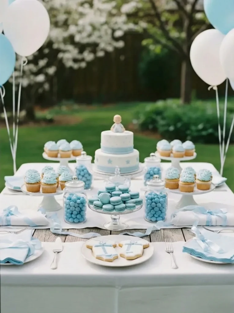 This outdoor dessert table keeps things beautifully classic with a soft blue and white palette that feels instantly calm and timeless. The clean white tablecloth sets the stage for delicate pastel treats like frosted cupcakes, stacked macarons, glass jars filled with blue candies, and a simple two tier cake topped with the sweetest little baby figure. Light blue ribbons, matching napkins, and pale balloons frame the table without overwhelming it, while the garden backdrop adds a fresh and airy feel that makes everything look effortlessly put together.
