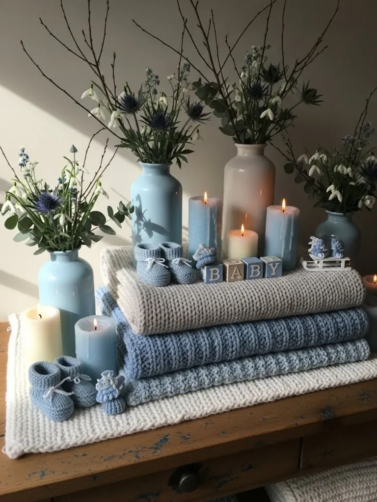 This setup feels like a warm winter hug wrapped in soft blue tones and cozy textures. Layered knitted blankets in shades of dusty blue and cream create a beautiful base that instantly feels comforting and thoughtful. Pale blue ceramic vases filled with delicate winter florals and bare branches add a natural seasonal touch without feeling cold. The soft candlelight scattered throughout brings a gentle glow that makes everything feel calm and intimate. Little details like the knitted baby booties and wooden letter blocks spelling baby make the whole display feel curated yet effortless.