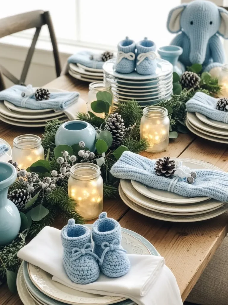 This setup feels like the coziest winter table you could imagine for a baby boy shower. Soft blue knitted booties sit sweetly on layered plates, paired with pale blue napkins tied up with little pinecones for a seasonal touch. The greenery running down the center looks fresh and wintry without feeling too holiday themed, which I really love. Warm candlelight from small glass jars adds that soft glow everyone secretly wants in winter, while the wooden table keeps everything grounded and natural. The little blue accents and plush details make the whole table feel thoughtful and gentle rather than overdone.