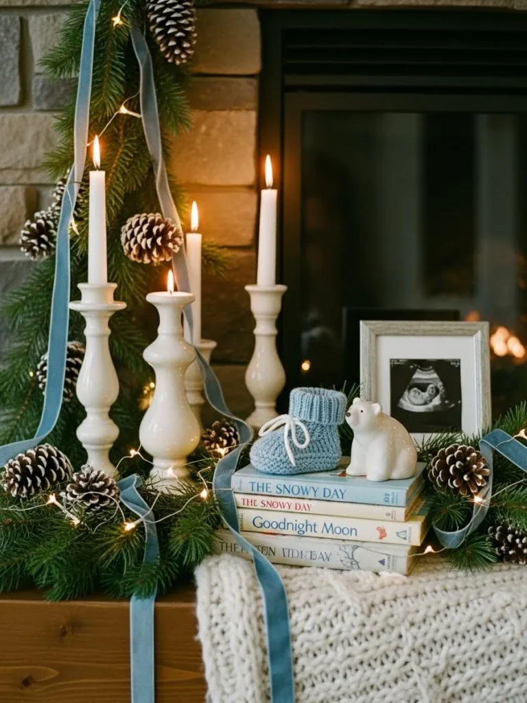 This setup feels like a winter hug wrapped around a fireplace mantel. Soft evergreen garlands spill gently across the wood, dotted with pinecones and warm twinkle lights that instantly set a calm and cozy mood. Creamy white candlesticks add that classic winter glow while pale blue ribbons weave through the greenery for a sweet baby boy touch. Little details like the tiny knitted bootie, a stack of beloved storybooks, and a framed ultrasound photo make the whole space feel personal and heartfelt without trying too hard.