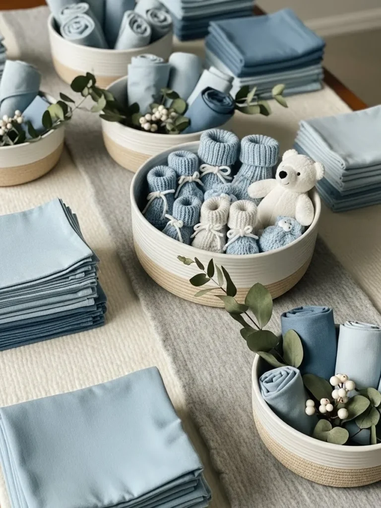 This setup is all about soft blue tones layered in the coziest, most thoughtful way. Neatly folded cloth napkins in different shades of blue are stacked with intention, while simple ceramic bowls hold rolled linens, tiny knit booties, and the sweetest little teddy bear detail. The mix of textures really stands out here. Smooth fabric, chunky knits, and natural greenery all work together to create a calm winter feel that still feels special and styled. Everything looks organized but not fussy, which is exactly what you want for a relaxed baby shower at home.