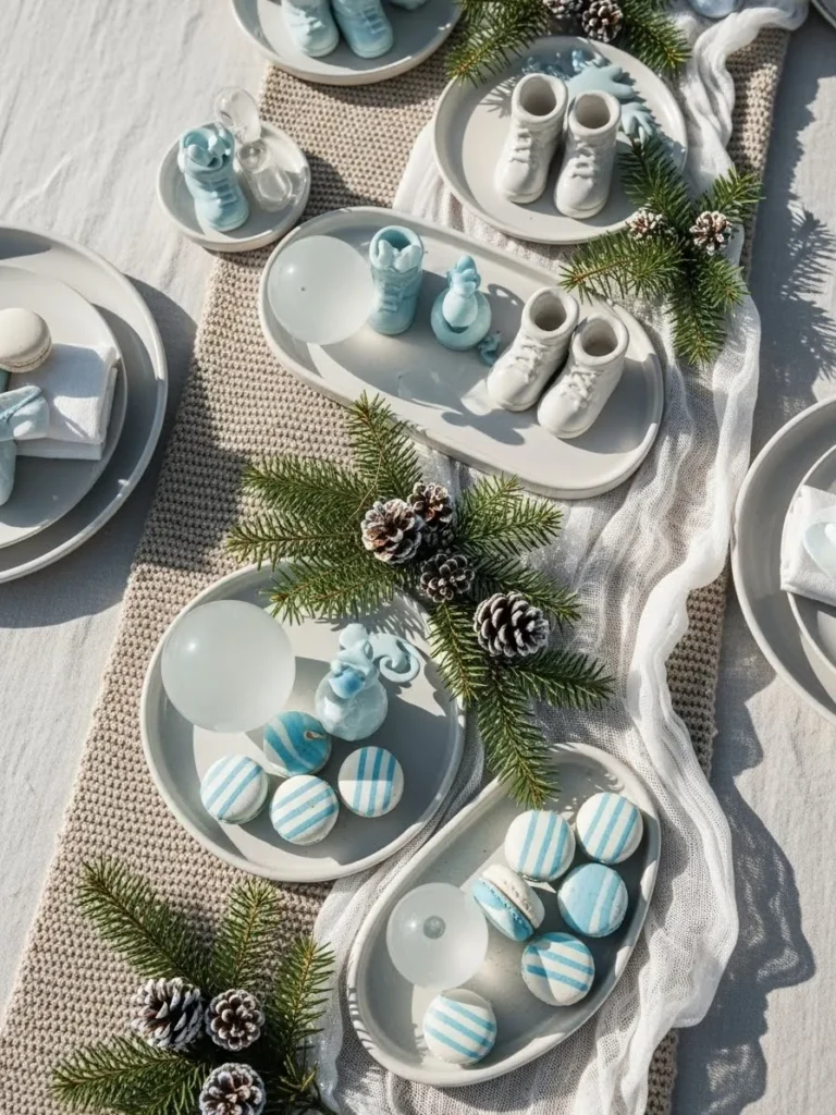 This table setting leans into soft blue and creamy white tones that feel calm, cozy, and perfectly winter ready. Neutral stoneware plates are styled with tiny baby booties, striped blue macarons, and simple glass accents that feel sweet without being over the top. Natural greenery and pinecones run through the center like a relaxed winter garland, adding texture and warmth against the light linen tablecloth. Everything feels thoughtfully placed yet effortless, which makes the whole setup look inviting rather than fussy.