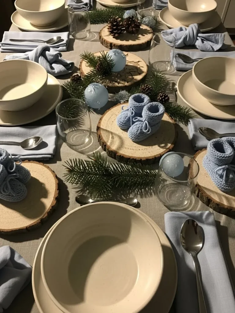 This cozy winter table setup feels calm and thoughtfully styled, with a soft blue and neutral palette that is perfect for a boy baby shower. The light linen tablecloth sets an easy relaxed base, while natural wood slice chargers add warmth and a rustic winter touch. Creamy ceramic bowls, simple clear glassware, and neatly folded blue napkins keep everything looking clean and uncluttered. The greenery woven through the table brings in that fresh winter feel, and the tiny knitted blue baby booties placed at each setting are such a sweet personal detail that instantly makes the table feel special.