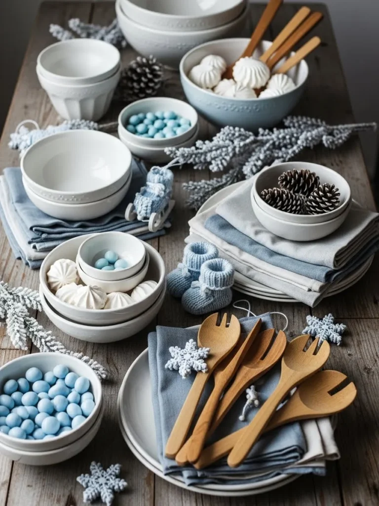 This cozy table setup leans into soft winter blues and gentle neutrals in the prettiest way. The layered ceramic bowls and plates feel simple but intentional, paired with pale blue napkins and natural wooden utensils that add just the right amount of warmth. Little details like frosted pinecones, delicate snowflake accents, and knitted baby booties give it that winter baby shower feel without being over the top. Everything feels calm, clean, and thoughtfully styled, which makes it perfect for a relaxed indoor gathering where guests can linger and feel at home.