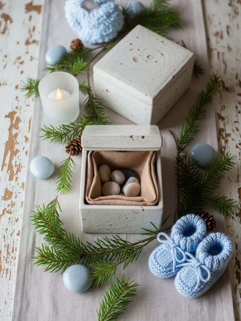 This setup feels like a quiet winter moment captured on a tabletop. Soft white wooden keepsake boxes sit on a neutral linen runner, surrounded by fresh pine sprigs, tiny pinecones, and gentle blue accents that instantly read baby boy without feeling theme heavy. The knitted blue booties and plush textures add warmth, while the small candle glow brings in that cozy winter vibe everyone secretly loves. It feels thoughtful and calm, like something you would put together slowly with intention rather than rushing through party prep.