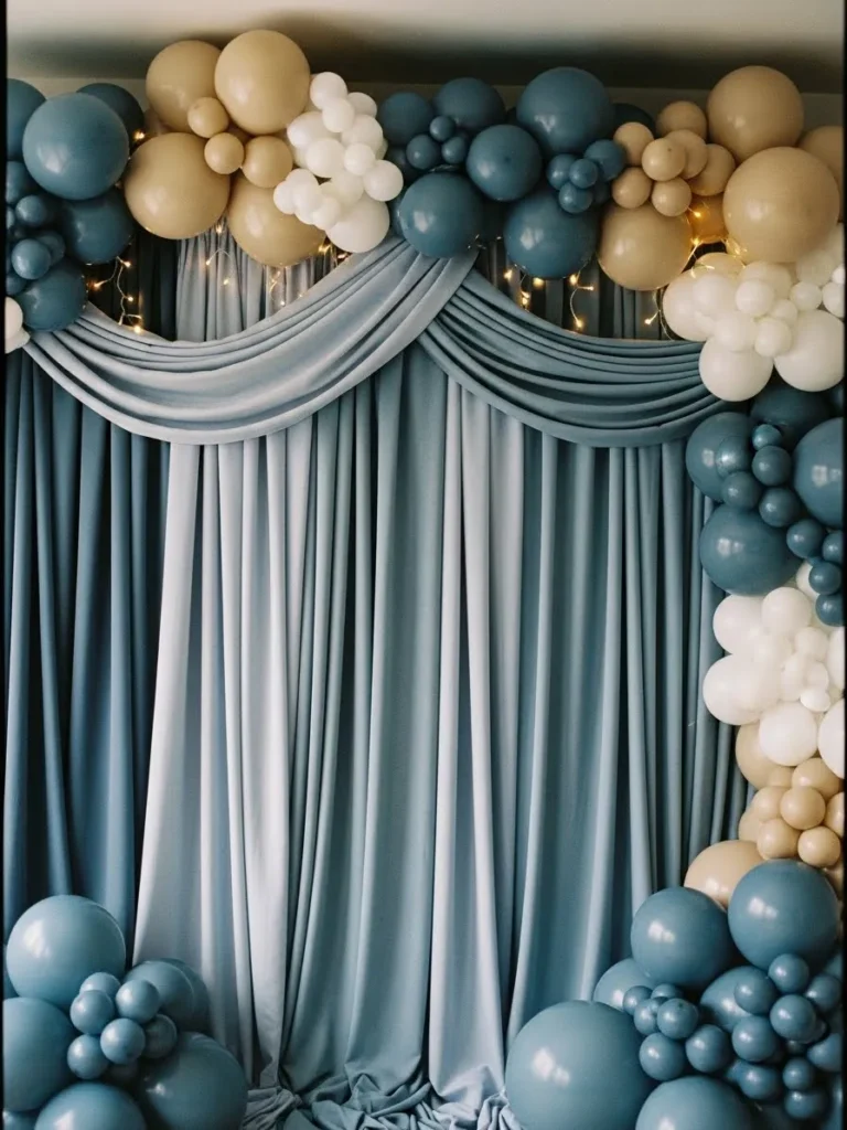 This setup feels like a cozy winter hug the moment you see it. The layered blue drapery creates a soft flowing backdrop that instantly warms up the room, while the mix of dusty blue cream and soft beige balloons adds depth without feeling loud. The gentle string lights tucked behind the fabric give off a subtle glow that feels perfect for a winter baby shower. Everything about this design feels calm thoughtful and inviting which makes it ideal for celebrating a little boy during the colder months.