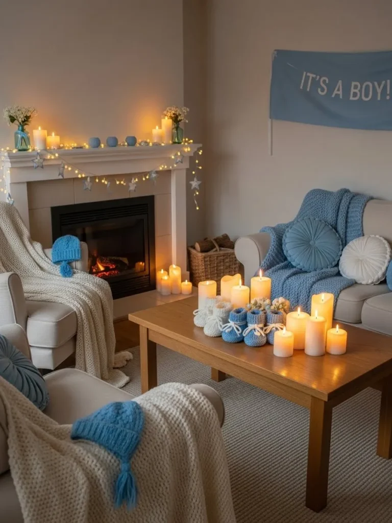 This living room setup feels like a warm winter hug with its soft blue color palette and candlelit glow. Plush armchairs are layered with chunky knit throws and round pillows that instantly make the space feel inviting. The fireplace becomes the natural focal point with twinkling fairy lights and soft candles lining the mantel, while subtle star details add a sweet baby shower touch. Blue accents show up everywhere from knitted booties on the coffee table to gentle decor pieces that tie the whole boy themed look together without feeling overdone.