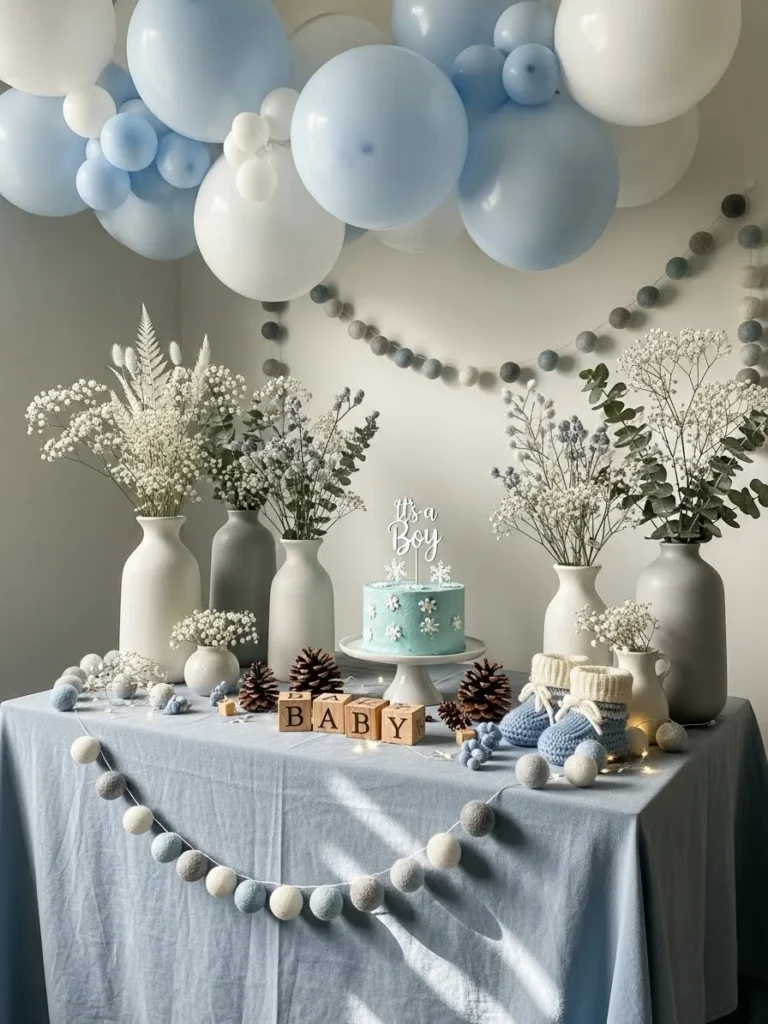 This setup leans into soft winter blues and creamy neutrals that instantly feel calm and cozy. The light blue balloons float overhead in a loose organic cluster that feels airy without overpowering the room. The table is styled with a simple pale blue linen cloth and layered with sweet details like felt ball garlands pinecones wooden baby blocks and tiny knitted booties. Ceramic vases in soft white and warm gray hold delicate dried florals which add texture without feeling busy. The small blue cake sits front and center and ties everything together with a clean and charming look that feels perfect for a winter baby shower.