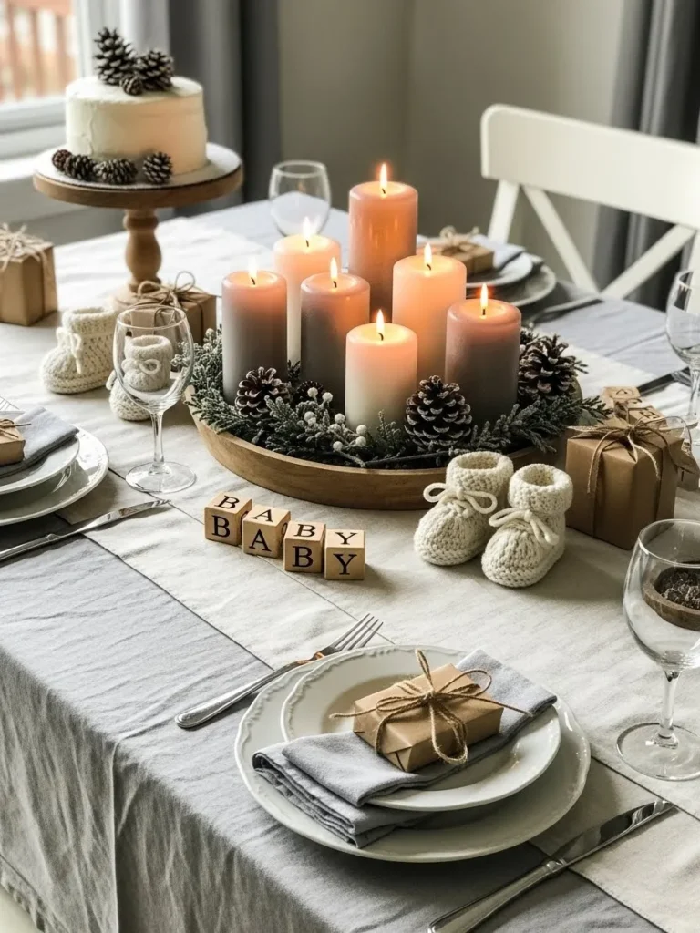 This cozy table setting leans into soft neutrals and winter textures in the prettiest way. A light linen tablecloth sets a calm base, layered with simple white plates, folded fabric napkins, and little wrapped favors that feel thoughtful but not fussy. The centerpiece steals the show with warm glowing candles arranged in a wooden tray, surrounded by pinecones and greenery for that subtle winter vibe. Sweet details like knitted baby booties, wooden letter blocks spelling baby, and a simple frosted cake add charm without overwhelming the space.