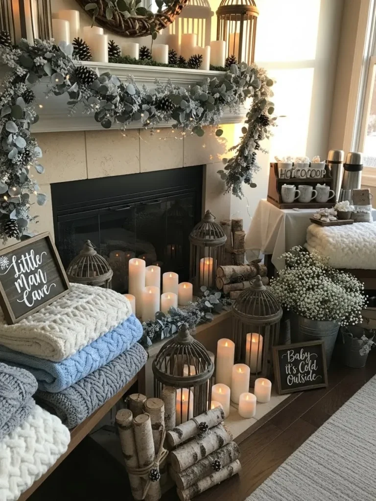 This setup centers around a softly styled fireplace that instantly sets a warm winter mood. Layered garlands with frosted greenery and pinecones frame the mantel, while glowing pillar candles and lanterns create that gentle golden light everyone loves in colder months. Chunky knit blankets in soft blues and neutrals are neatly stacked for texture and comfort, and rustic touches like birch logs and metal lanterns keep the space feeling relaxed and homey. Little details like winter themed signs and a hot cocoa station nearby make the whole corner feel thoughtful and perfectly suited for a cozy baby celebration.