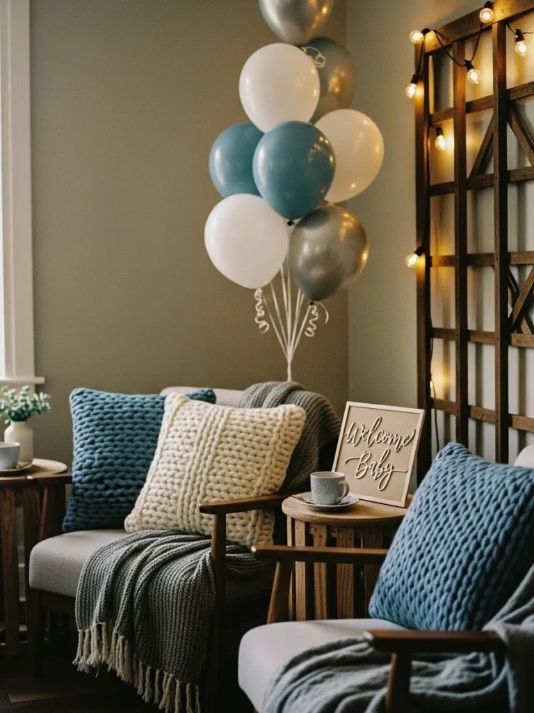 This living room setup feels like a soft winter hug with its layered blues warm lighting and plush textures everywhere you look. Chunky knit throws and pillows in gentle shades of blue and cream make the seating area feel extra inviting while the soft neutral walls keep everything calm and balanced. The baby blue balloons add a playful touch without overpowering the space and the simple Oh Boy sign keeps the theme sweet and understated. Little wintery details like candlelight soft florals and neutral table linens bring everything together in a way that feels cozy polished and very intentional.