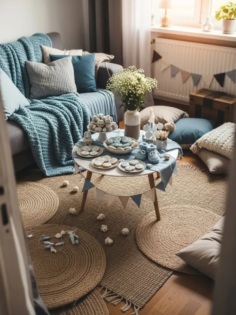 This cozy living room setup leans into soft blue tones, gentle textures, and a relaxed, intimate layout that feels perfect for a boy baby shower at home. The gray sofa layered with chunky knit throws and muted blue pillows instantly sets a calm mood, while the low round coffee table becomes the sweet centerpiece for treats, tiny decor details, and soft florals. Natural woven rugs on the floor add warmth and texture, and the floor seating with cushions makes the whole space feel welcoming and unpretentious. Little details like fabric bunting, neutral ceramics, and soft window light pull everything together without feeling staged or overdone.
