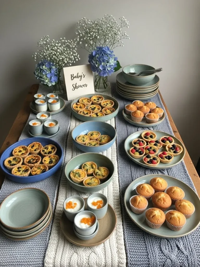 This cozy baby shower setup feels like it was styled with care rather than rushed together. The muted blue and soft gray tableware keeps everything calm and welcoming, while the mix of ceramic plates and bowls adds that collected over time look. Bite sized tarts, muffins, and creamy desserts are arranged neatly but not perfectly, which makes the table feel lived in and warm. Fresh florals in gentle blue tones and delicate white stems soften the scene and bring a sweet baby boy touch without going overly themed. The knitted runner underneath adds texture and makes the whole setup feel extra homey.