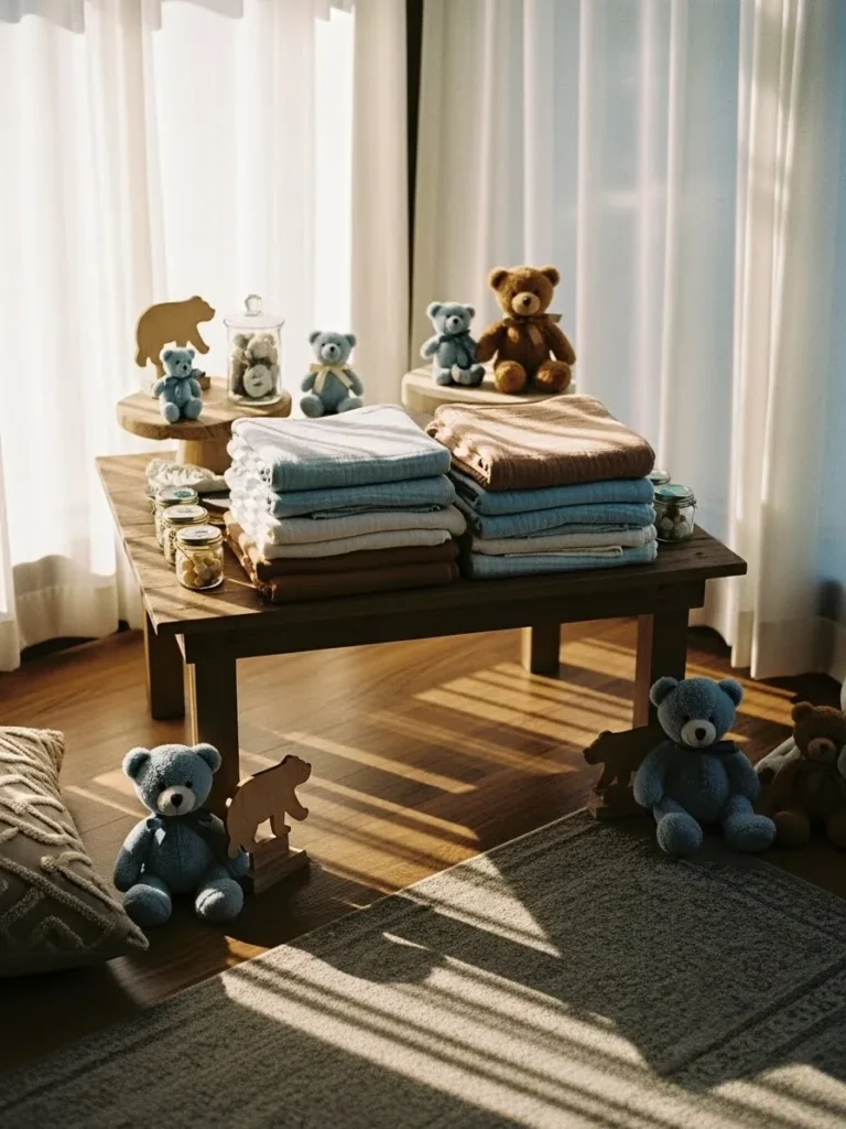 This setup feels like a cozy little corner pulled straight from a nursery dream. A low wooden table anchors the space and is layered with neatly folded blankets in soft blues creams and warm neutrals. Little teddy bears sit casually around the table which instantly adds that sweet boy baby shower energy without feeling themed to death. Glass jars with simple treats and natural wood accents keep everything grounded and calm while sheer curtains let in the prettiest warm daylight. The whole scene feels intimate relaxed and very homey like something you would want guests to linger around.