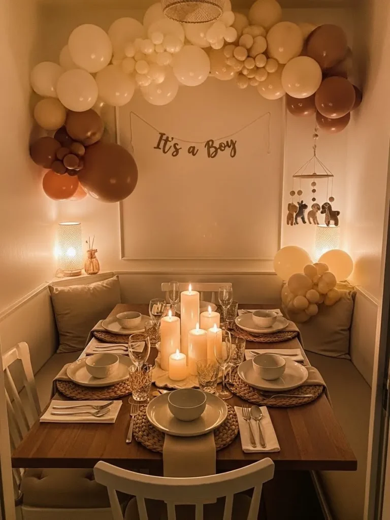 This cozy dining nook feels like the definition of intimate and warm. Soft neutral balloons in creamy whites and gentle browns frame the wall and instantly soften the space without overwhelming it. The wooden table is styled simply with woven placemats, neutral dishware, and layers of glowing candles that make everything feel calm and welcoming. Warm table lamps tucked into the corners add that golden evening glow that makes a small space feel extra special. Even the little wall details and hanging decor keep things sweet and subtle, which works perfectly for a boy baby shower that leans cozy instead of flashy.