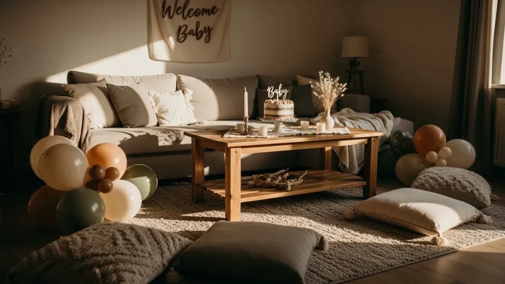 I love this kind of setup because it feels so doable and genuinely warm. It reminds me of the kind of baby showers where people linger longer and actually talk instead of rushing around. The neutral palette feels calming and grown up but still playful enough for a baby celebration. I also really like how this would photograph beautifully without feeling staged which is always my goal for cozy gatherings at home. It proves that a few thoughtful elements can create a really lovely moment without going over the top.