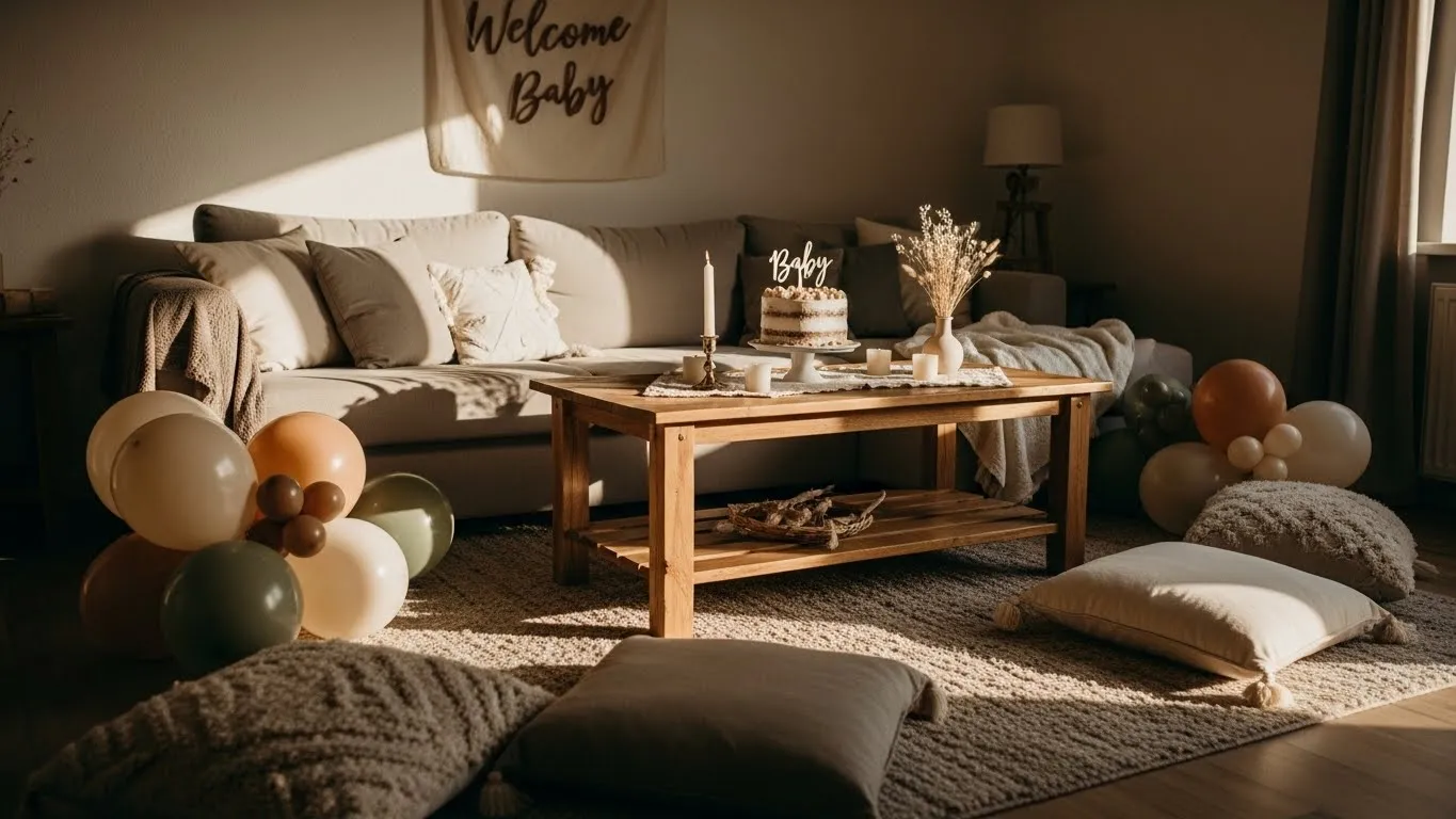 This cozy living room setup feels perfectly suited for an intimate boy baby shower with its soft blue and warm neutral palette. The plush sofa layered with knitted throws and cloud like cushions creates an inviting spot for guests to relax and chat. Gentle blue and white balloons add a celebratory touch without overpowering the space, while teddy bears and baby themed accents bring in that sweet nursery feel. The bookshelf styled with books, keepsakes, and warm string lights makes the room feel lived in and personal, not staged or overly styled. Natural light filtering through sheer curtains keeps everything bright yet calm, which is exactly the kind of mood you want for a heartfelt gathering.