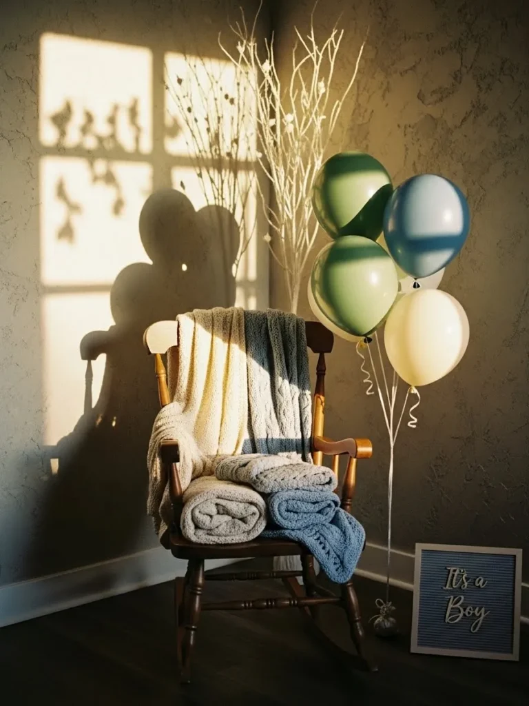 This cozy baby shower setup leans into warmth and simplicity with a wooden rocking chair layered in soft knit blankets and neutral textures. The muted blue and cream color palette feels calm and timeless while still clearly celebrating a baby boy. Natural sunlight streams in and casts gentle shadows on the wall which instantly makes the space feel lived in and intimate. The cluster of balloons in soft greens blues and warm ivory adds a playful touch without overpowering the room and the dried branches bring in a subtle organic feel that keeps everything grounded and relaxed.