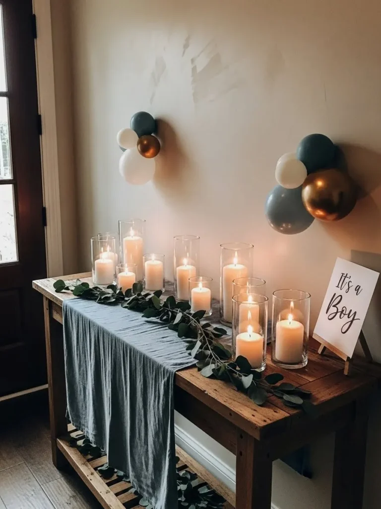 I love this design because it proves you do not need a huge space or tons of decorations to make a baby shower feel special. The candlelight alone sets such a comforting mood and makes guests slow down and linger a bit longer. If you are into cozy gatherings that feel intimate and thoughtful, this kind of setup really speaks my language. It feels warm welcoming and quietly beautiful, which is exactly the vibe I want when celebrating a baby boy.