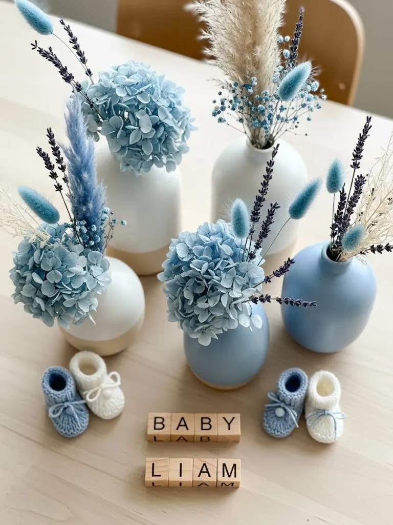 This cozy setup features a calm mix of soft blue and creamy white tones styled across a simple wooden table. Matte ceramic vases in varying shapes hold dried florals like pampas grass lavender and preserved hydrangeas which instantly add texture without feeling fussy. The muted color palette keeps everything gentle and soothing while the natural materials make the whole scene feel grounded and warm. Small knit baby booties and wooden letter blocks bring in those sweet personal touches that make the space feel intentional and heartfelt rather than styled just for show.