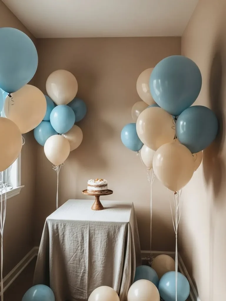 This setup leans into soft neutrals and muted blue tones to create a calm little corner that feels cozy and intentional. The balloon clusters are loose and airy rather than overly structured which keeps the look relaxed and homey. Creamy whites mixed with dusty blue balloons feel gentle and timeless without screaming theme. The small table draped in a natural linen cloth adds texture and warmth while the simple cake stand keeps the focus on just one sweet centerpiece instead of visual clutter. Everything feels scaled down in the best way which makes the space feel intimate and welcoming rather than styled for a huge crowd.