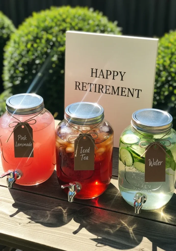 This outdoor drink station features glass jars filled with colorful beverages, neatly arranged on a wooden table with a clear retirement sign placed behind them. The setup feels fresh and inviting, with greenery in the background and plenty of sunlight highlighting the glass and liquid. It is practical, pretty, and easy to enjoy.
