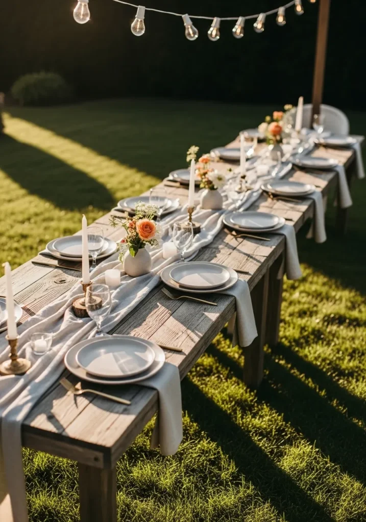 This wooden dining table is set on the lawn with neutral linens, simple plates, and tall candles that add height and warmth. The late afternoon light stretches across the grass, giving everything a soft golden glow. The overall look feels peaceful and thoughtfully arranged.