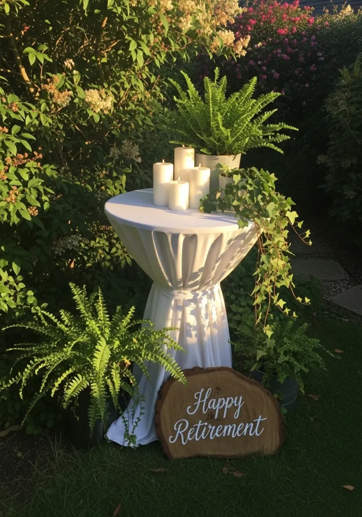 This small pedestal table is tucked into a garden corner, styled with white candles, greenery, and a gentle retirement sign. The fabric drape softens the look, while the surrounding plants help it blend naturally into the outdoor space. It feels like a sweet little moment rather than a main feature.