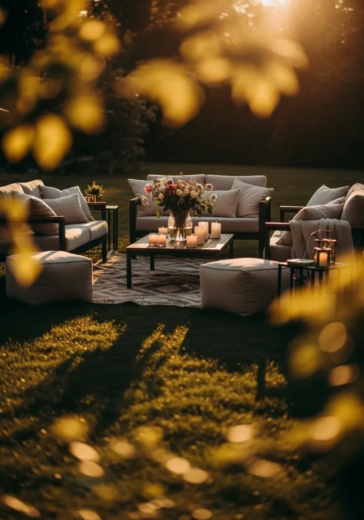 This outdoor lounge area is arranged with soft cushions, a low table, and subtle decor placed near the seating. Candles and gentle light create an inviting atmosphere as the sun begins to set. The layout encourages conversation and comfort.