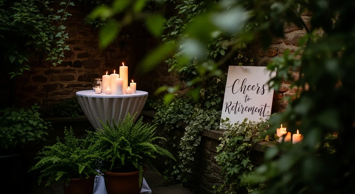 This setup feels like a deep breath to me. The mix of nature, candlelight, and clean styling makes it perfect for a meaningful retirement celebration. It feels calm and reflective in the best possible way.