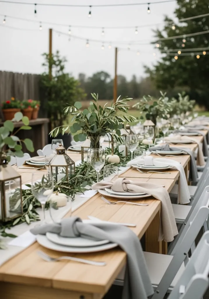This long outdoor table is styled with natural greenery running through the center and soft neutral linens. Wooden chairs keep the look grounded and relaxed, while string lights overhead add a gentle sense of celebration. The overall setup feels calm, balanced, and very inviting.