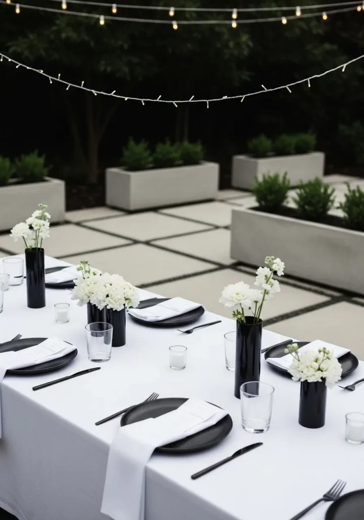 This table uses crisp white linens, dark accents, and simple floral details to create a clean and modern look. The setting feels open and uncluttered, with lighting that keeps things soft rather than dramatic. Everything feels intentional without being cold.