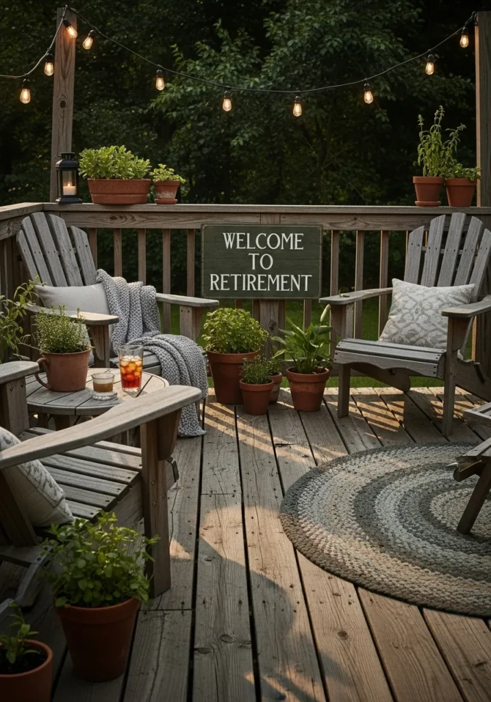 This deck seating area features soft cushions, neutral tones, and a small sign that marks the occasion. The layout feels relaxed and familiar, like an extension of the living room. Everything feels welcoming and personal.