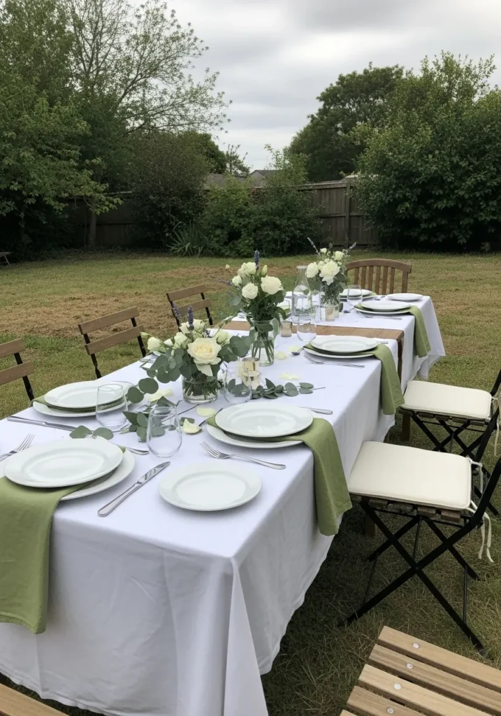 This outdoor table is styled with white linens and soft green details that tie into the surrounding lawn. Folding chairs keep the setup casual and flexible. The layout feels open and easy.