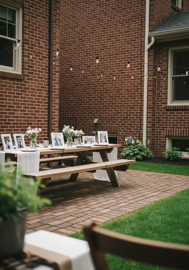 This setup combines a long dining table with a small memory display nearby featuring framed photos and candles. The covered patio keeps everything feeling cozy and protected, while still letting the outdoors shine through. It feels thoughtful and personal.
